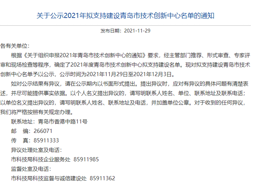 2021年11月29,青岛市科学技术局发布了《关于公示2021年拟支持建设青岛市技术创新中心名单的通知》。