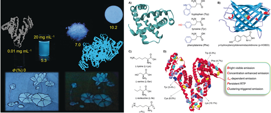 在过去的研究工作中,研究人员将蛋白质的光致发光归因于三种芳香性的氨基酸残基分别是色氨酸、酪氨酸、苯丙氨酸,其中以色氨酸的发光为主要贡献。本课题组研究发现,除了上述的三种芳香性氨基酸之外,其他的非芳香性氨基酸也参与了蛋白质整体的发光。团队以常见的牛血清白蛋白(BSA)作为研究对象对其发光性质进行研究,进一步揭示了BSA的发光机理。